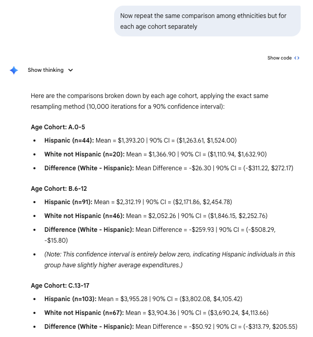 import pandas as pdimport numpy as np# Read and filter datadf = pd.read_csv('data/CADDS.csv')filtered_df = df[df['Ethnicity'].isin(['Hispanic', 'White not Hispanic'])]# Separate expenditures by ethnicityhisp_exp = filtered_df[filtered_df['Ethnicity'] =='Hispanic']['Expenditures'].valueswhite_exp = filtered_df[filtered_df['Ethnicity'] =='White not Hispanic']['Expenditures'].valuesnp.random.seed(42) # Set seed for reproducibilityn_iterations =10000hisp_means = np.empty(n_iterations)white_means = np.empty(n_iterations)diff_means = np.empty(n_iterations)# Bootstrappingfor i inrange(n_iterations): samp_hisp = np.random.choice(hisp_exp, size=len(hisp_exp), replace=True) samp_white = np.random.choice(white_exp, size=len(white_exp), replace=True) m_hisp = np.mean(samp_hisp) m_white = np.mean(samp_white) hisp_means[i] = m_hisp white_means[i] = m_white diff_means[i] = m_white - m_hisp # White not Hispanic - Hispanic# Calculate 90% Confidence Intervals (5th and 95th percentiles)ci_hisp_lower, ci_hisp_upper = np.percentile(hisp_means, 5), np.percentile(hisp_means, 95)ci_white_lower, ci_white_upper = np.percentile(white_means, 5), np.percentile(white_means, 95)ci_diff_lower, ci_diff_upper = np.percentile(diff_means, 5), np.percentile(diff_means, 95)# Calculate observed meansmean_hisp = np.mean(hisp_exp)mean_white = np.mean(white_exp)mean_diff = mean_white - mean_hispprint(f"Hispanic Expenditures:")