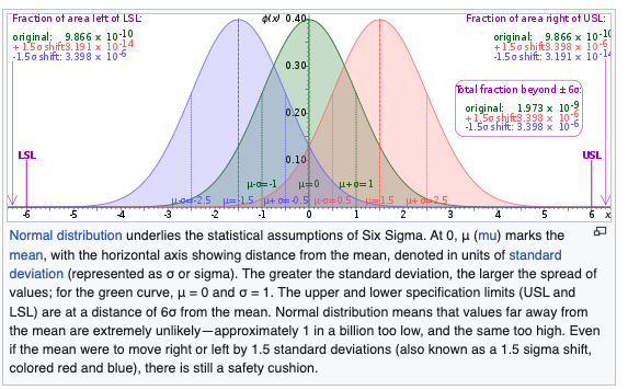 6\sigma is a widely used tool in TQM [total quality management]. But 6\sigma isn’t actually 6\sigma. The famous mantra that goes with it is 3.4 dipmo [defects per million opportunities]. This means that the outer limit [and it only considers one-sided/tailed] on defects is 0.0000034.